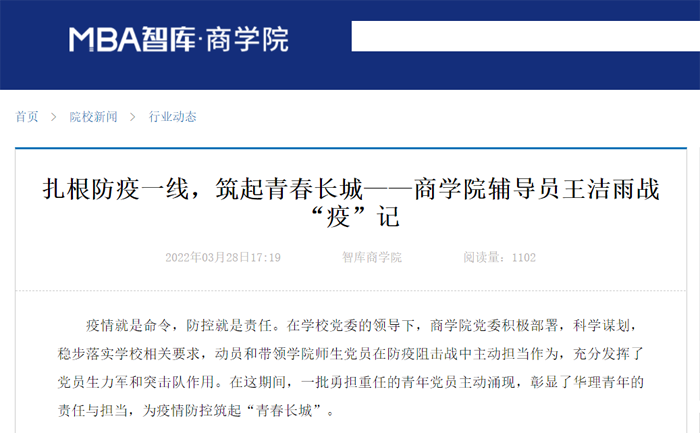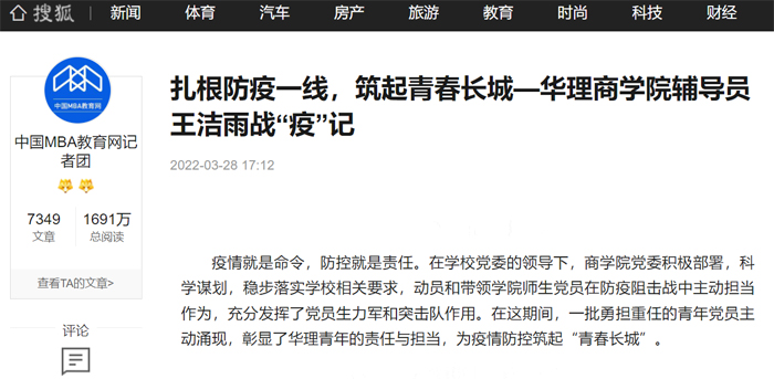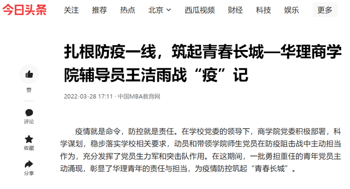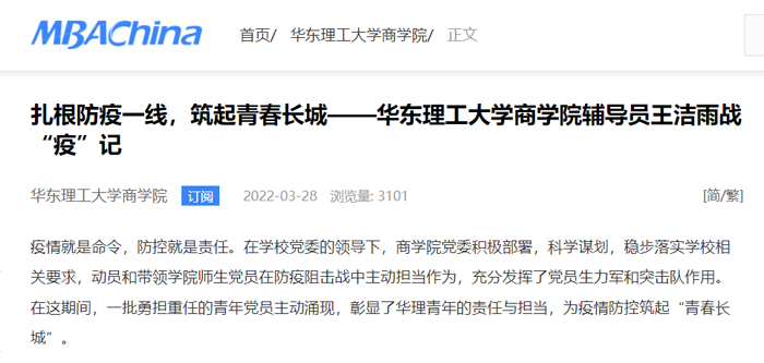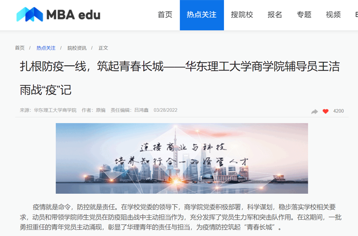 疫情就是命令,防控就是责任。在学校党委的领导下,商学院党委积极部署,科学谋划,稳步落实学校相关要求,动员和带领学院师生党员在防疫阻击战中主动担当作为,充分发挥了党员生力军和突击队作用。在这期间,一批勇担重任的青年党员主动涌现,彰显了华理青年的责任与担当,为疫情防控筑起“青春长城”。以下是媒体报道集锦: