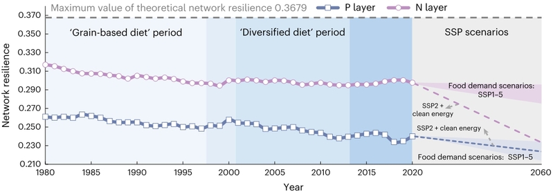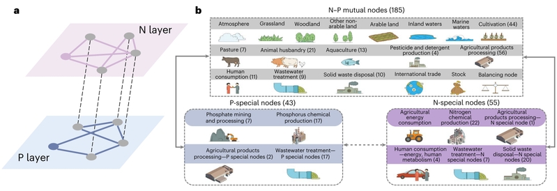 氮和磷元素既是食品系统的重要营养元素,也是导致环境污染的关键物质。联合团队通过物质流分析方法首次构建了中国氮-磷耦合循环网络,在此基础上运用生态网络分析等方法测度了网络韧性并揭示了其影响因素。研究表明:中国氮-磷耦合循环网络为由283个节点组成的双层网络,其中185个节点为氮磷耦合节点,通过氮和磷元素在自然生态系统和食品系统的代谢过程将氮网络层和磷网络层紧密连接在一起,从而形成复杂的氮-磷耦合循环系统。在1980-2020年间,中国的氮-磷耦合循环网络处于过度高效阶段,韧性呈下降趋势,氮、磷网络层韧性最大最小值之差分别为7.61%和12.57%。这将导致中国氮-磷耦合系统抗击外界风险冲击的能力发生降低,存在系统性崩溃的风险。食品需求增长驱动的化肥施用比例增加是导致氮-磷耦合网络韧性降低的关键因素。中国的氮-磷耦合循环网络中的节点对氮网络层和磷网络层韧性的变化同时存在协同效应和权衡效应。相比氮网络层而言,磷网络层受到人类活动的影响更大。
