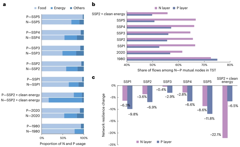 基于共享社会经济路径(SSP)情景,联合团队还预测了中国2060年的氮-磷耦合循环网络及其韧性。研究表明:在SSP2+清洁能源情景下,中国的氮-磷耦合系统将受到绿氨和锂电池等清洁能源需求的驱动而发生代谢规模和代谢路径变化。清洁能源需求对氮网络层影响较大,而食品需求对磷网络层影响更显著。清洁能源需求会导致更多的流量集中在氮和磷特有节点,削弱了氮网络层和磷网络层之间的耦合强度。如无任何调控措施,中国氮-磷耦合循环网络的韧性将进一步降低(特别是氮网络层),不仅会降低氮-磷耦合系统抗风险冲击能力,从而威胁到中国的粮食安全,而且还可能会向环境排放更多的活性氮,从而扰乱氮元素循环,加剧能源和粮食系统之间的冲突。